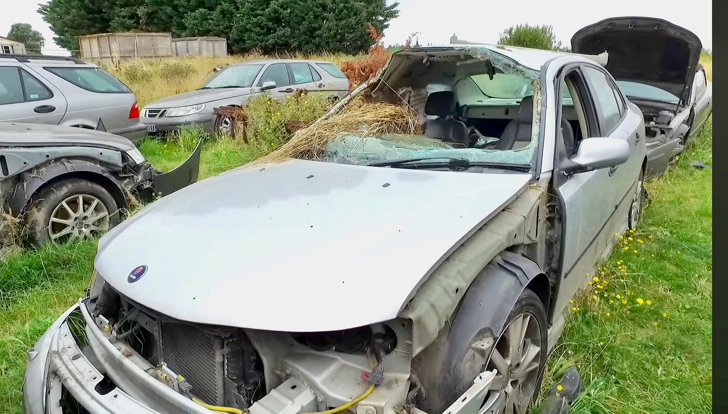 The yard is littered with Saabs in various conditions, panels missing, headlights gone and more. A graveyard that serves to provide donor parts from every model therein.