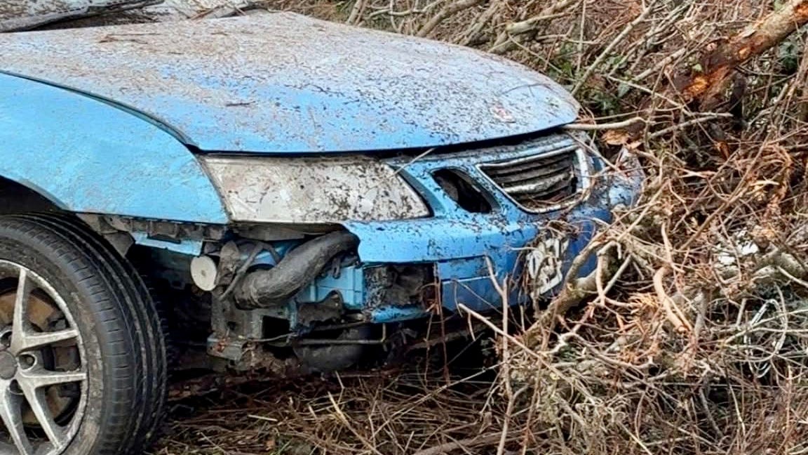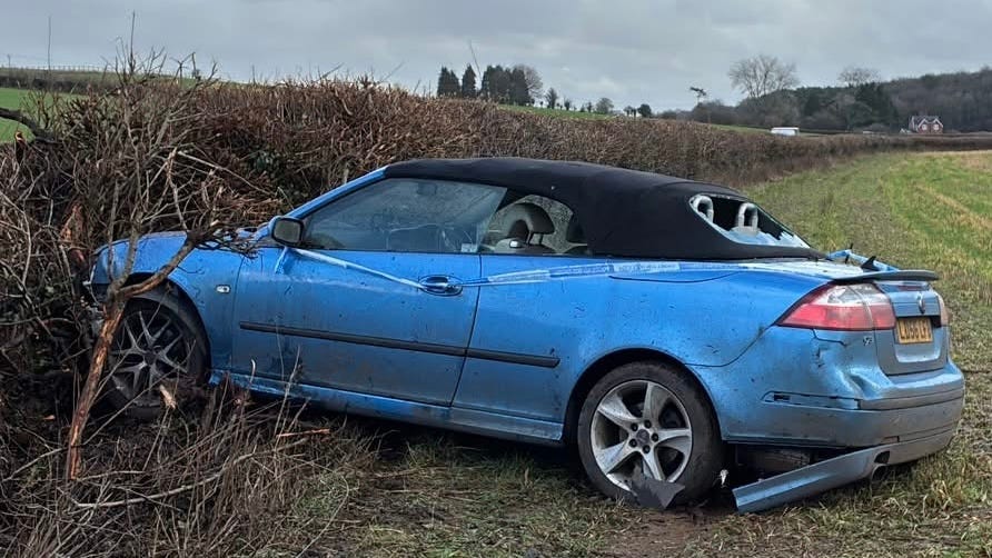 Landing in a field, and nearly crashing through a hedgerow, things could have ended way worse the damage to the car is major, with the front end mostly gone, and many underlying components destroyed. But the main cabin remains solid.